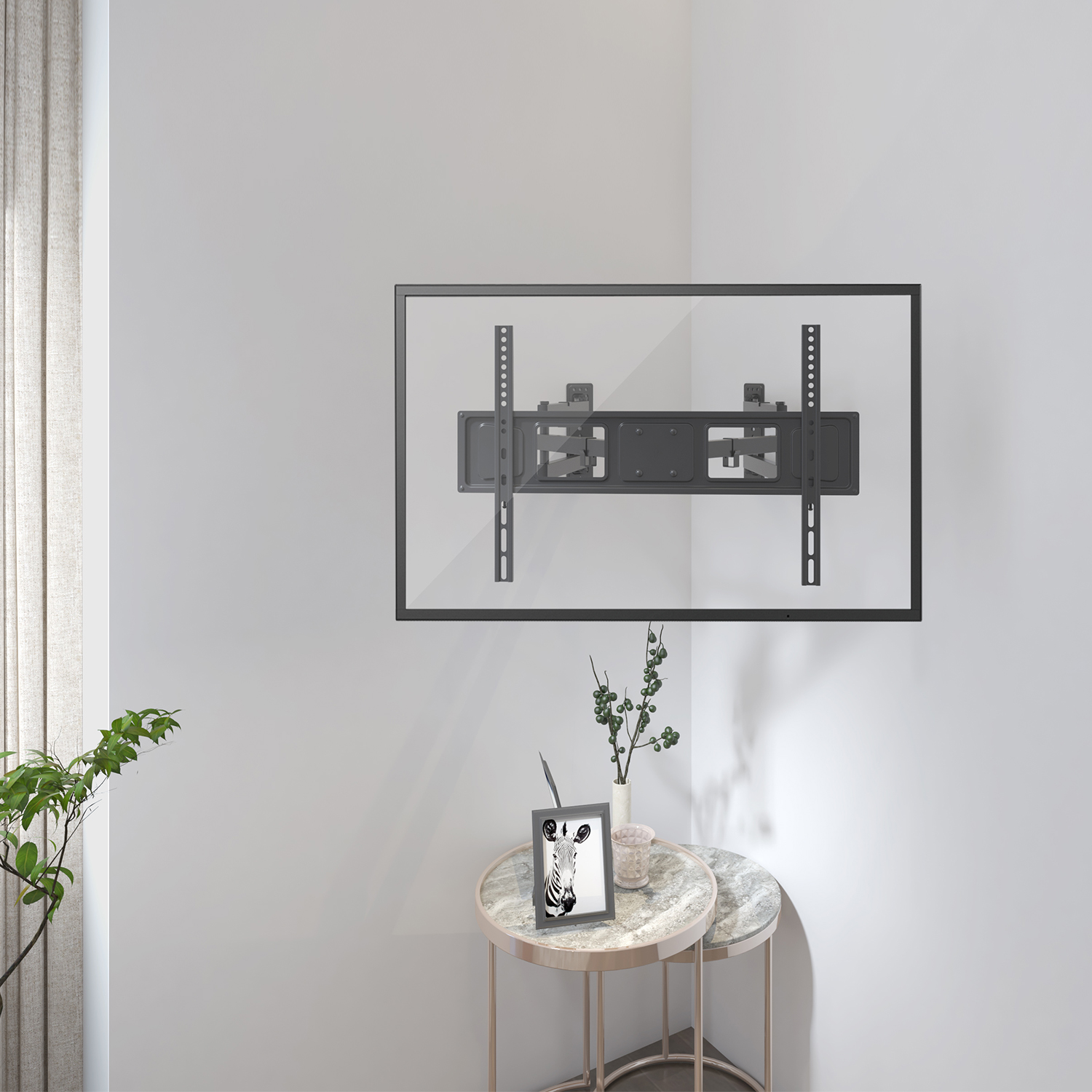 Unlike traditional mounts, this bracket is purposebuilt for corner installation, allowing you to securely anchor your TV across two walls while still enjoying smooth, fullrange motion. The 20" dualextension arm glides outward to position your screen exactly where you want it, then retracts neatly back toward the corner for a clean, spacesaving look.