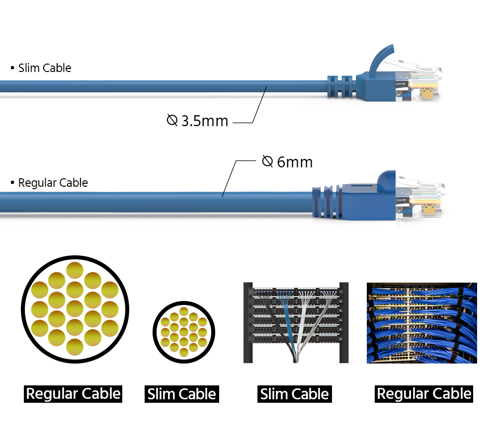 CAT6A Slim Line Ethernet cable is the solution to reduce congestion in high-density CAT6A Network environments , such as data centers telecommunication and server rooms , with the CAT6A Slim Line you can fit more cables in the same space , cable diameter is almost half a standard CAT6A cable.