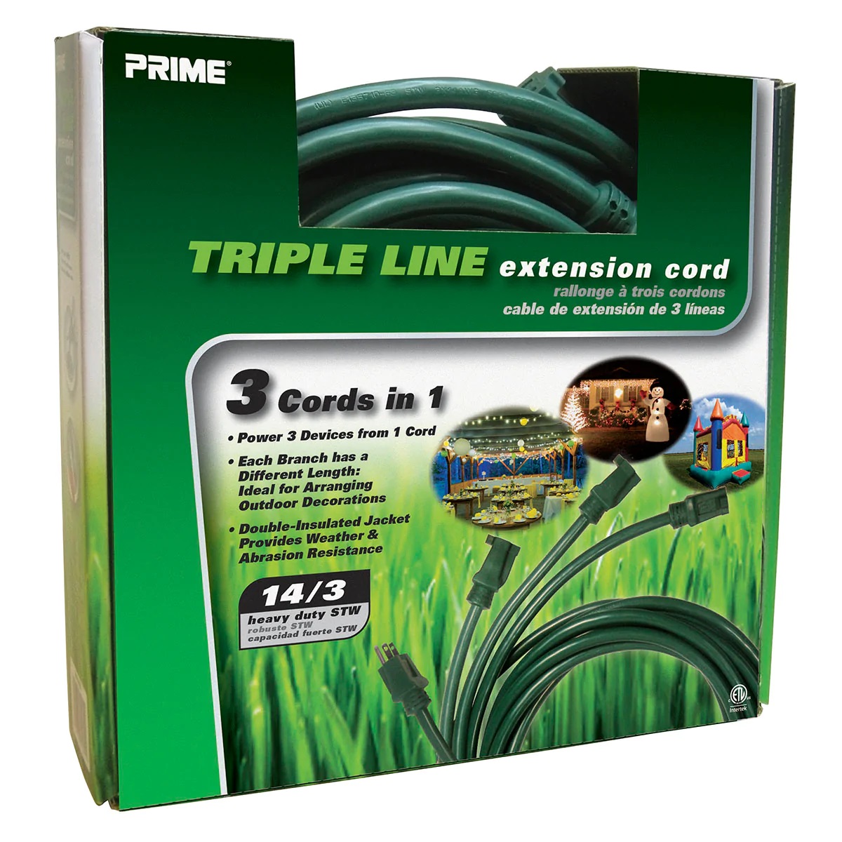 With this unique cord you can power 3 devices from 1 extension cord. The cord is built with length plug to wall at 5ft. Three branches are 3ft, 6ft and 9ft which enables each branch be strategically positioned for outdoor lighting decorations. The double-insulated jacket provides weather and abrasion resistance.