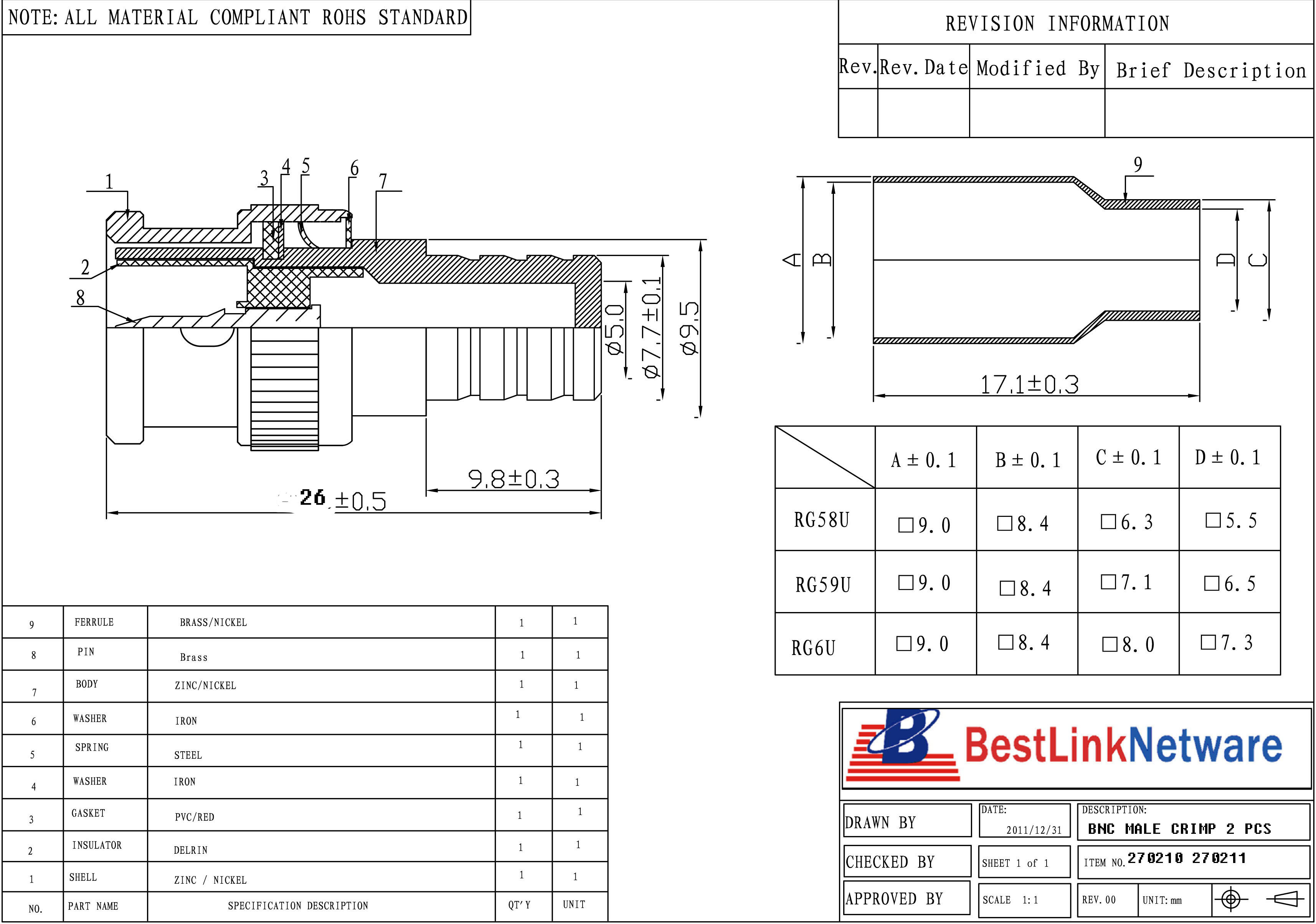 RG59 BNC Male Crimp-on Connector 2pc (Connector + Ferrule)